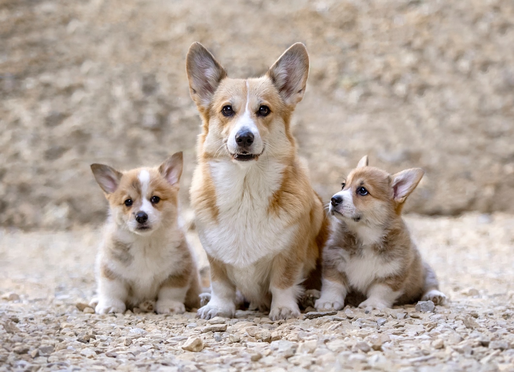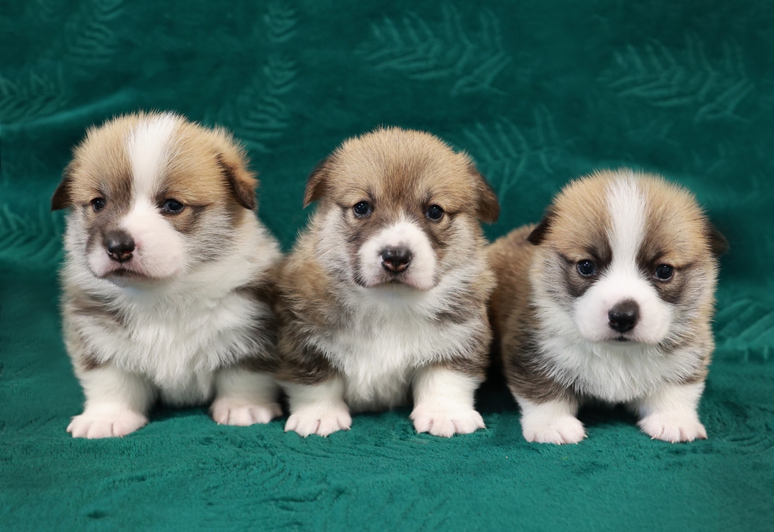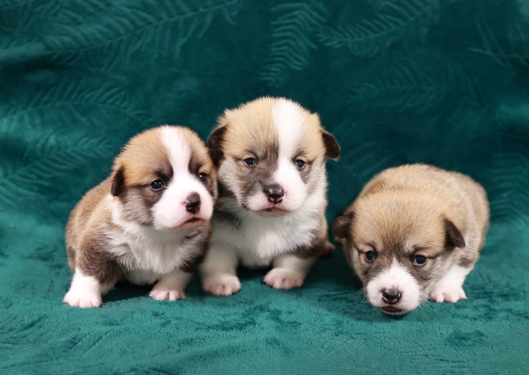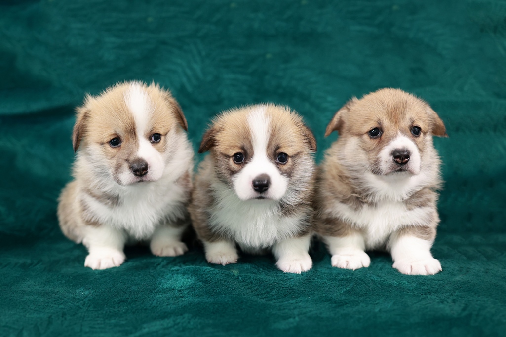 Dwie suczki corgi z ogonkami i jedna suczka z krótkim ogonem, wszystkie rudo białe.